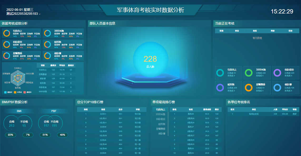 作訓部門首長領導可通過考核實時數據分析視圖頁,全麵實時查看訓練考核整體情況,通過視圖實時了解考核完成情況及進展信息。
